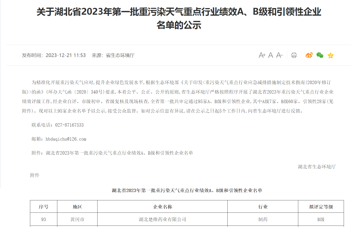 12月21日,从湖北省生态环境厅传来消息,湖北楚维药业药业有限公司被省生态环境厅评为制药行业B级绩效企业。这是对楚维药业近年来在环保建设方面成绩的充分肯定,为企业下步生产经营顺利进行打下了坚实基础。据悉,楚维药业是黄冈市本批次入选的唯一一家企业,也是截至目前黄冈化工园入选的唯一一家医药化工企业。